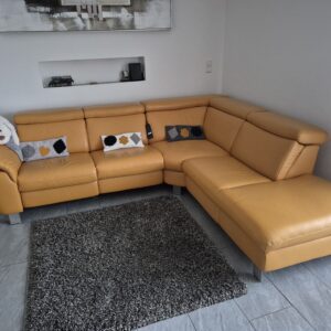 Longlife-Ledersofa mit 2 elektr. Ralexstühlen in curry