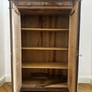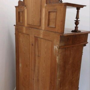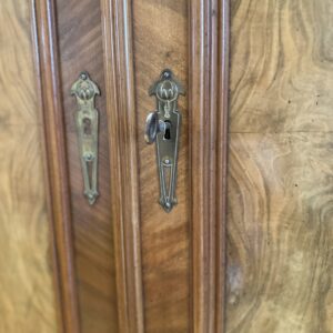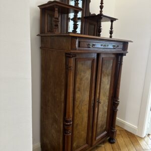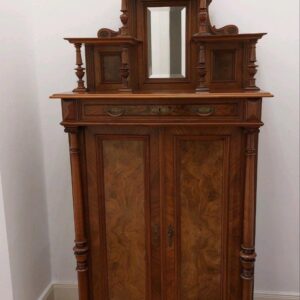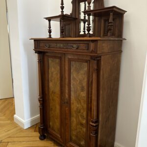 Ausstattung: Aufsatz mit Spiegel, gedrechselte Säulen, Schublade mit Messinggriffen, zwei Türen mit reich gemasertem Furnier, innen 3 Einlegeböden, originale Beschläge