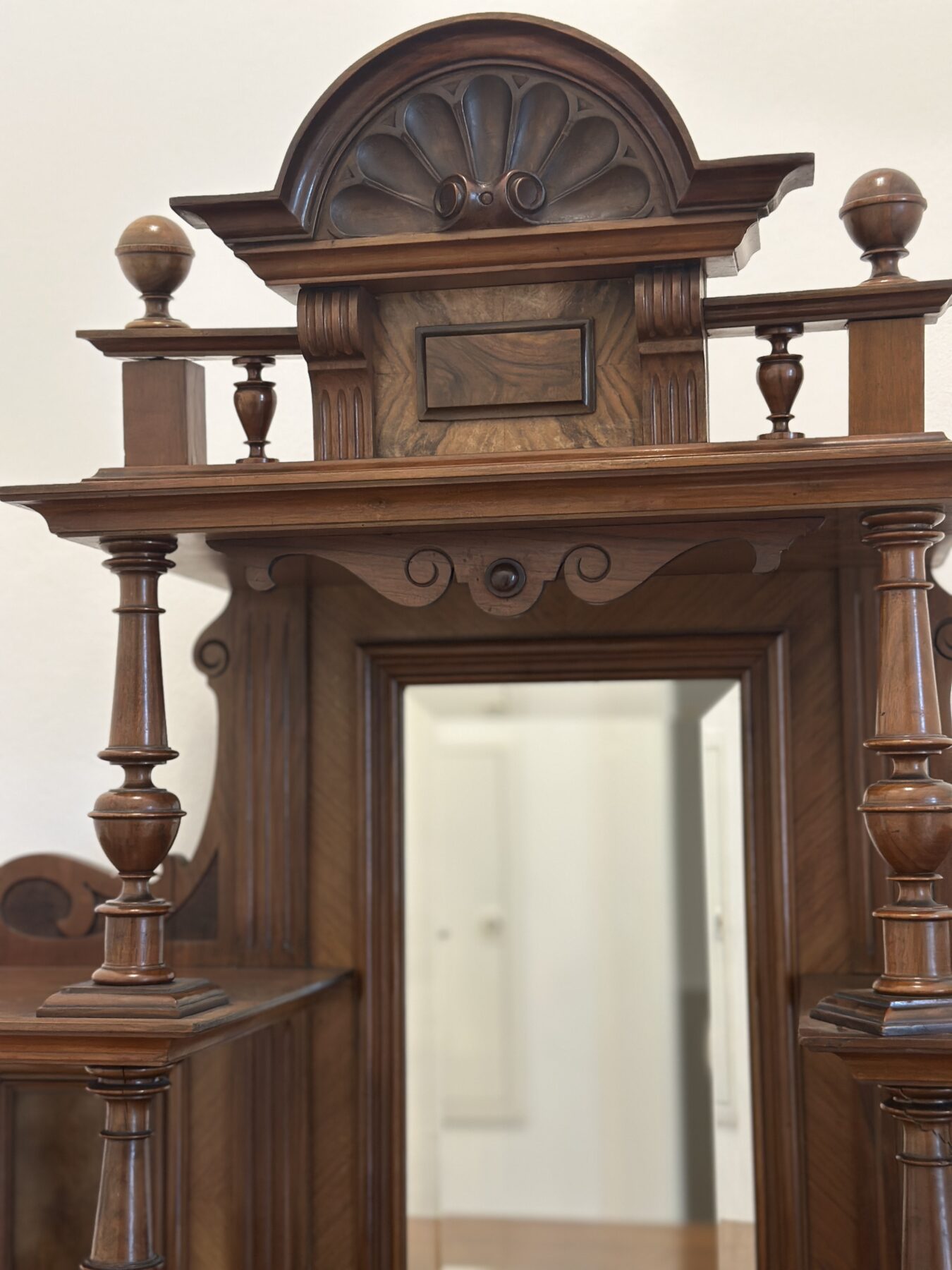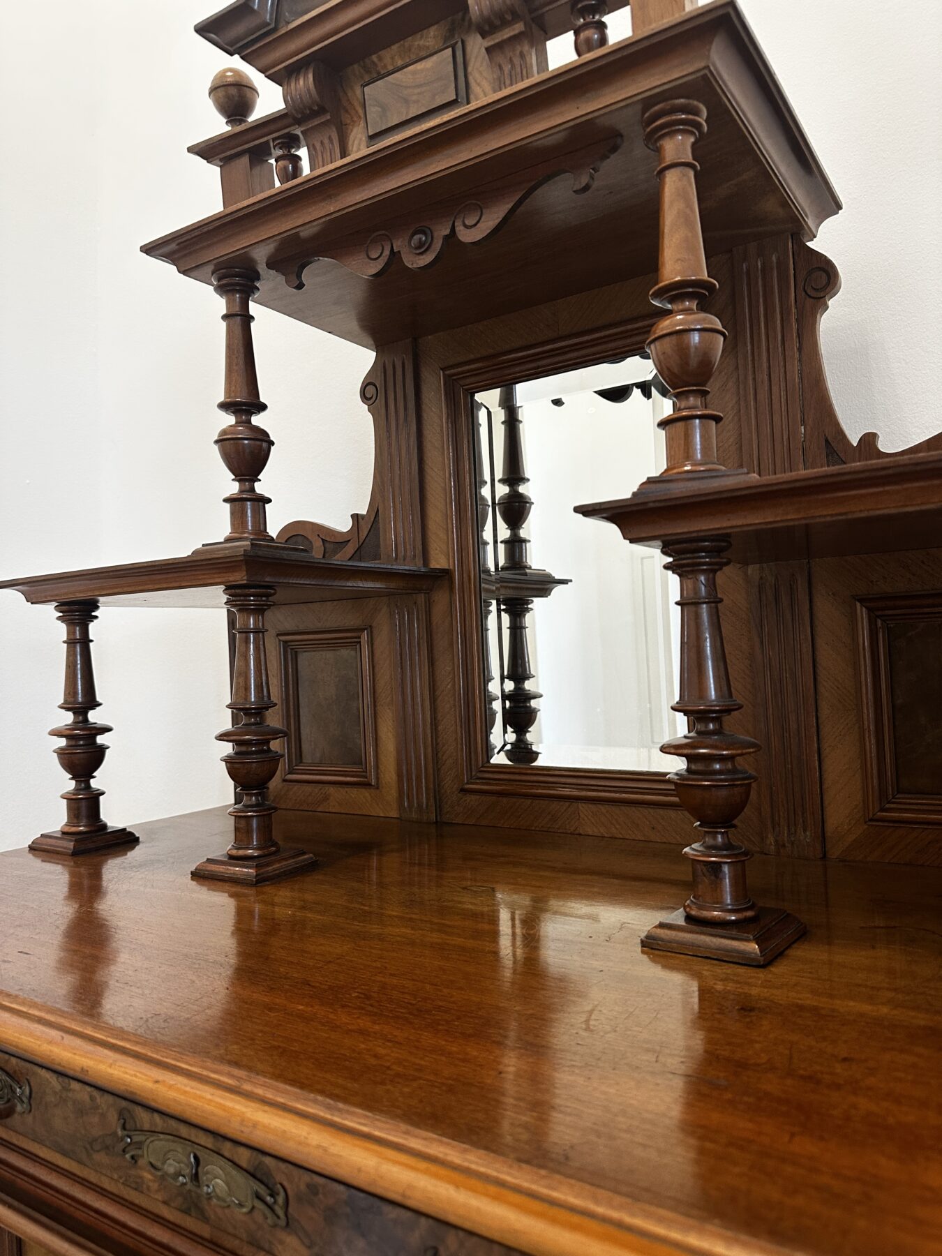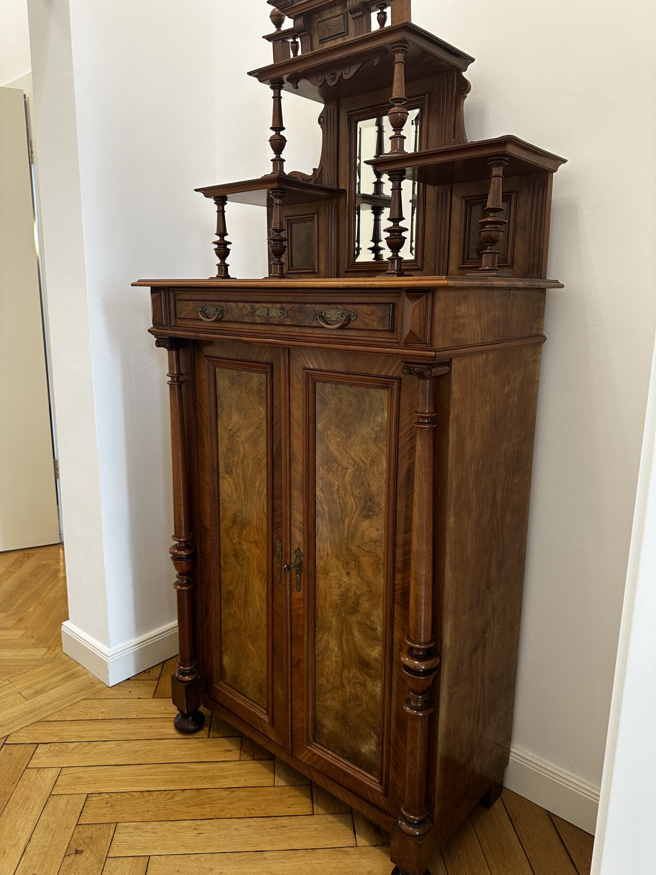 Wunderschöner, originaler Aufsatzschrank aus der Gründerzeit (um 1880–1900), gefertigt aus massivem Holz mit aufwändigem Nussbaumfurnier. Das Möbel besticht durch seine prachtvolle Architektur mit gedrechselten Säulen, stilvollen Pilastern, aufgesetztem Spiegel und feinen Intarsien. Die originale Patina unterstreicht den authentischen Charakter und macht den Schrank zu einem besonderen Blickfang – ob als Garderobe, Vitrinenschrank oder für die stilvolle Aufbewahrung im Wohn- oder Esszimmer.