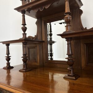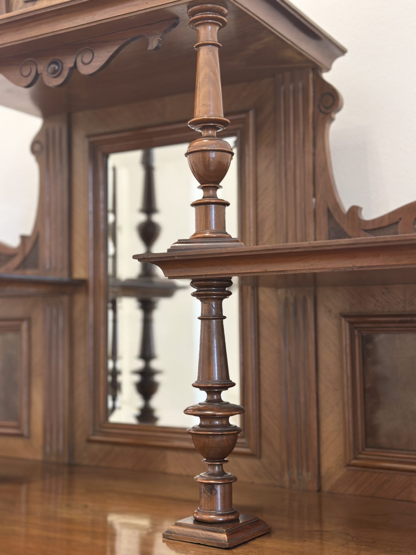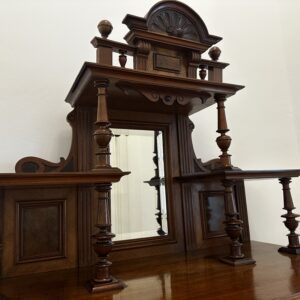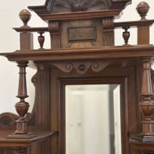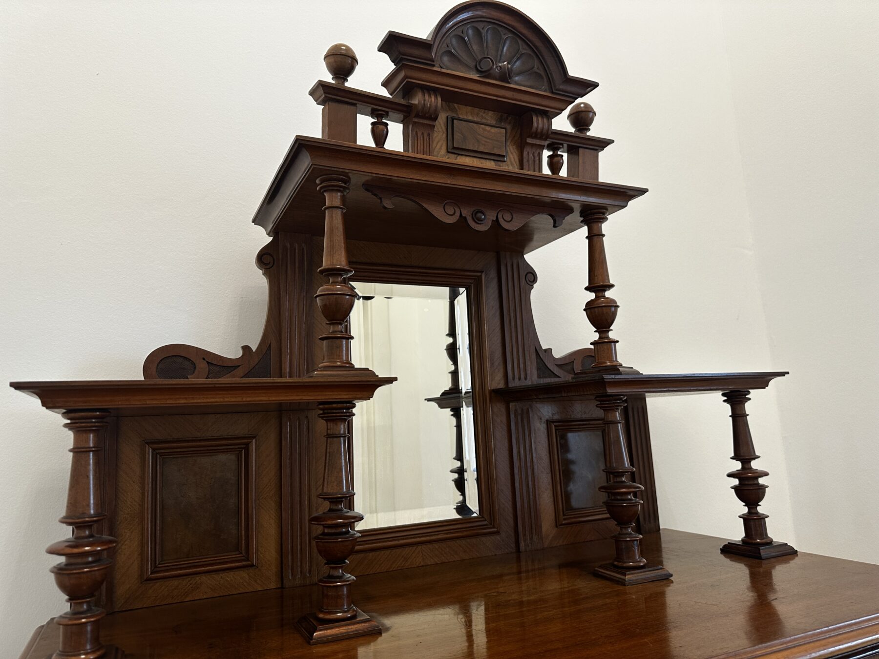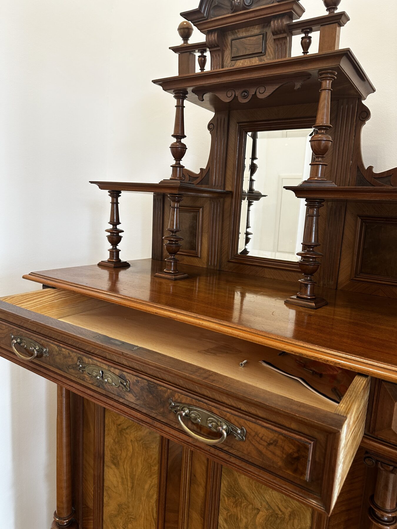 Wunderschöner, originaler Aufsatzschrank aus der Gründerzeit (um 1880–1900), gefertigt aus massivem Holz mit aufwändigem Nussbaumfurnier. Das Möbel besticht durch seine prachtvolle Architektur mit gedrechselten Säulen, stilvollen Pilastern, aufgesetztem Spiegel und feinen Intarsien. Die originale Patina unterstreicht den authentischen Charakter und macht den Schrank zu einem besonderen Blickfang – ob als Garderobe, Vitrinenschrank oder für die stilvolle Aufbewahrung im Wohn- oder Esszimmer.