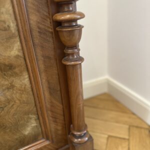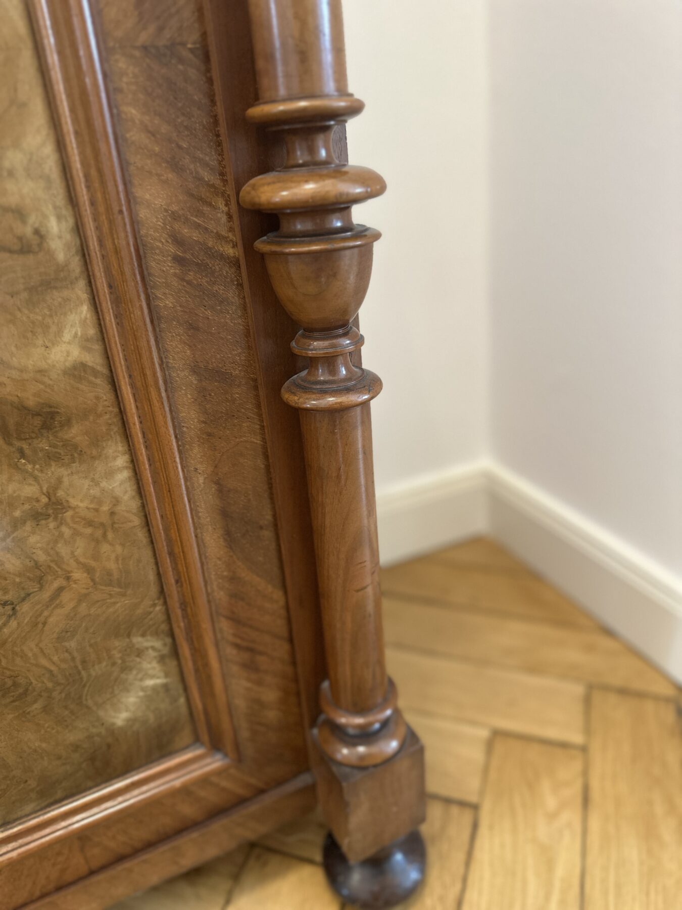 – Gedrechselte Säulen, feinste Nussbaumfurnierarbeit, Intarsien