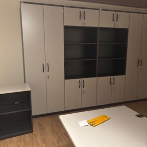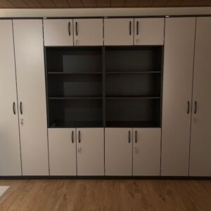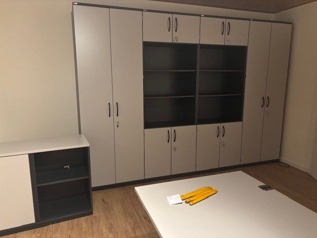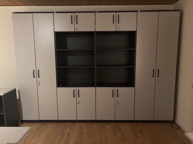 2 x Modulschrank 6 Ordnerhöhen Metalsockel mit Höhenausgleichsschrauben, unten 2OH Drehtür mit Schließung, oben 1OH Drehtür mit Schließung mittig 2OH offen Regal Dimension: B/T/H 800/441/2261