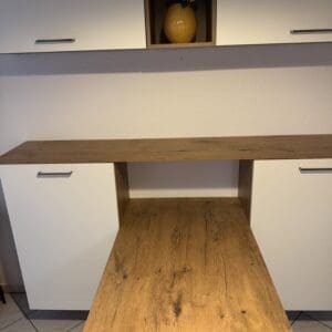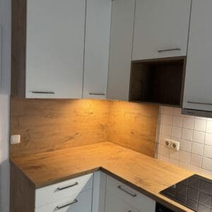 – Arbeitsplatte & Nischenverkleidung: Wildeiche-Dekor – warm, wohnlich & robust
