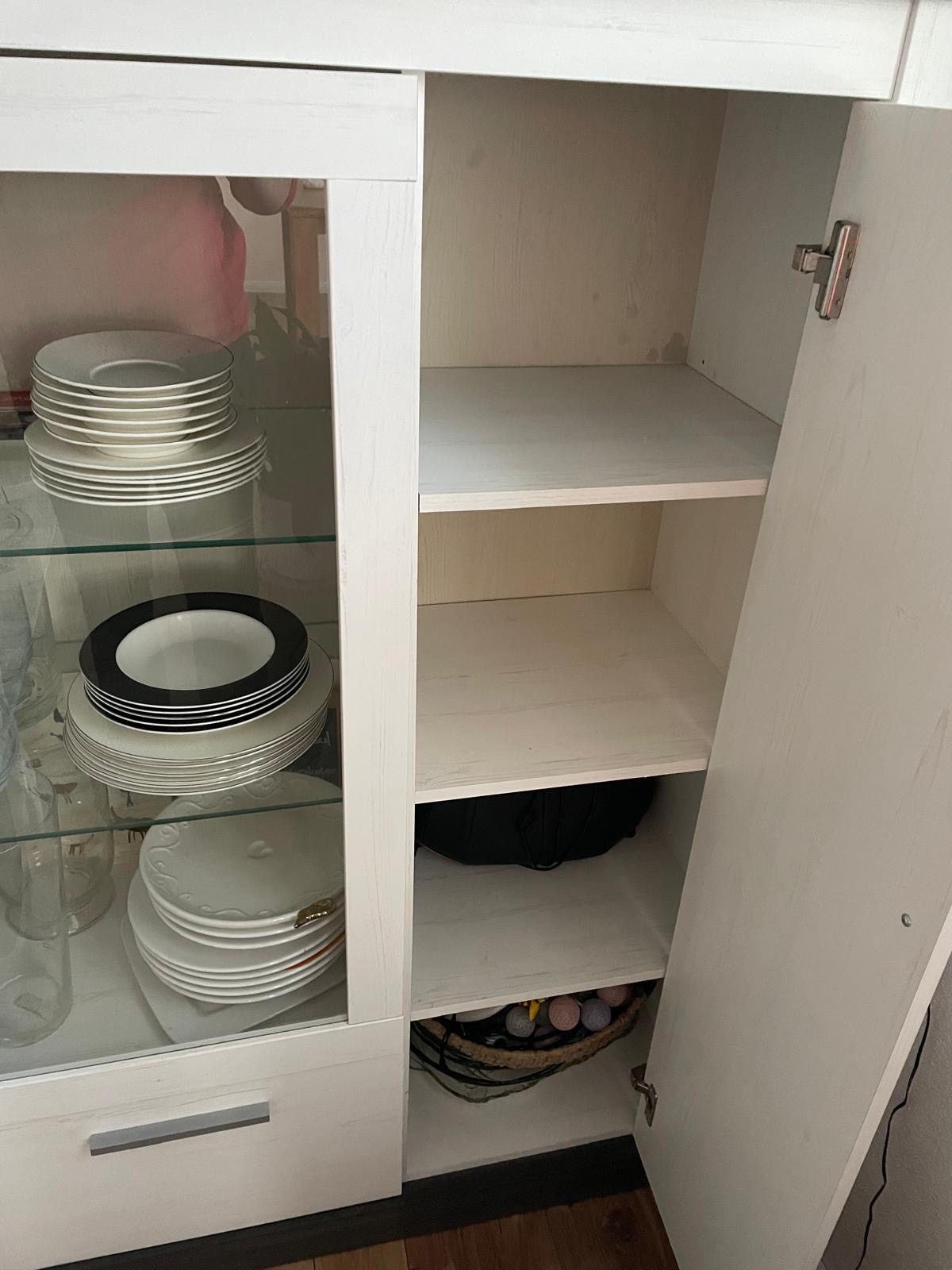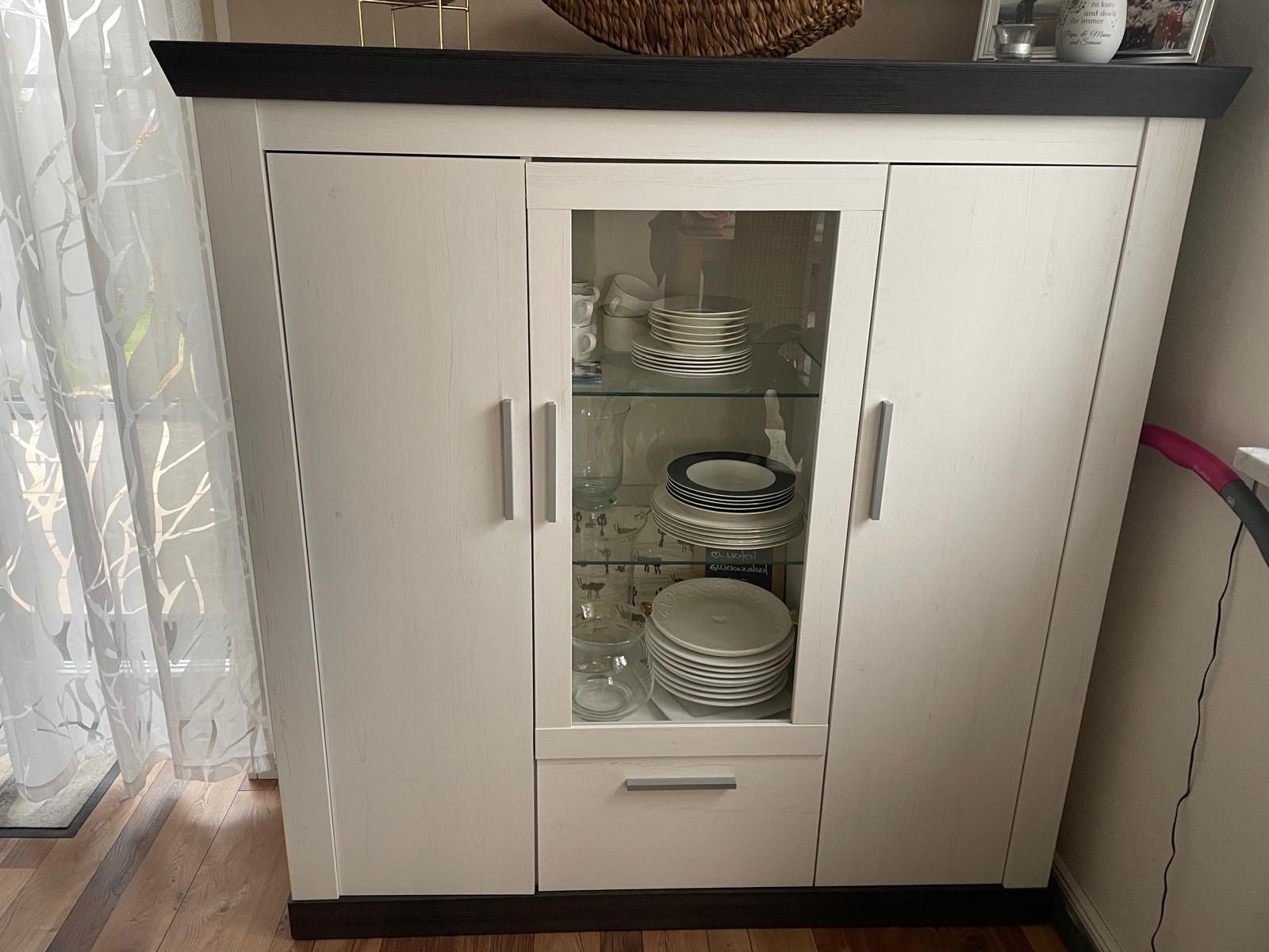Das Highboard hat eine Oberfläche in weißem Pinienholz mit länglicher Struktur und einem wengefarbenen Aufsatz. Der Schrank hat rechts und links 4 Einlegeböden und in der Mitte eine Glastür mit weiteren 3 Einlegeböden aus Glas . Ganz unten gibt es noch ein Schubfach.Also insgesamt viel Platz für Geschirr, Bücher, Kleinkram etc.