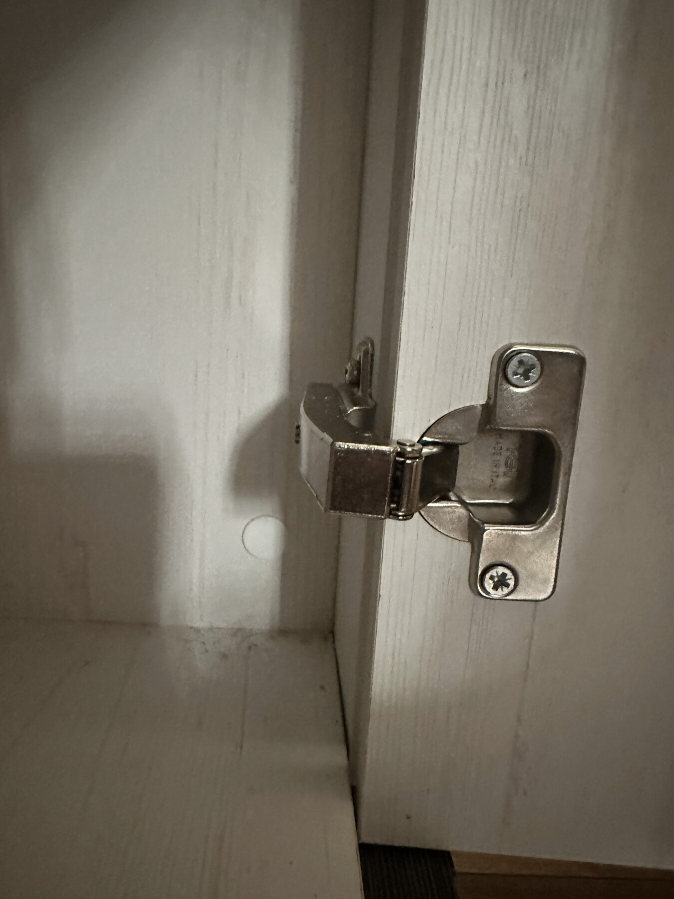 Leider hat das Highboard einen Makel. Die rechte Tür musste mit einem neuen Scharnier versehen werden. Wir mussten etwas improvisieren, da das originale Scharnier eine besondere Ausführung war (Öffnungsmechansmus 270 Grad, normale Scharniere haben 180 Grad)