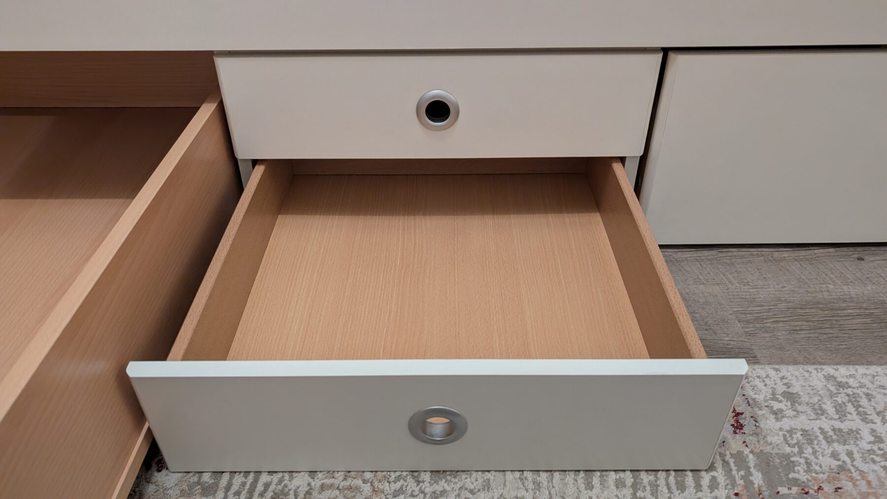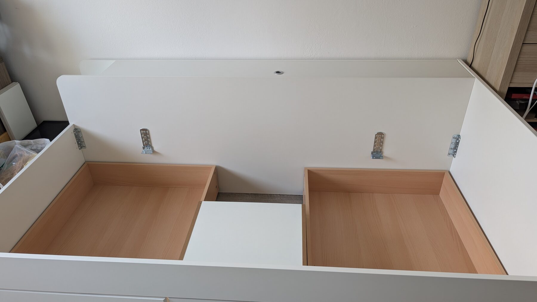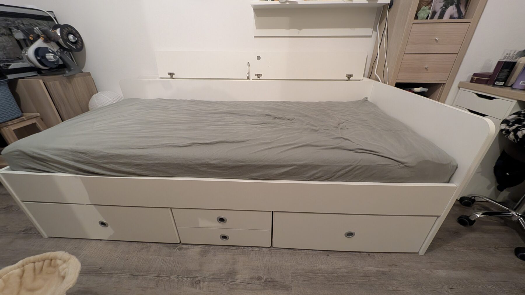 Es verfügt über sehr viel Stauraum durch einen Bettkasten mit zwei Kammern, zwei großen und zwei kleinen Schubladen sowie offenen Fächern am Fußende.