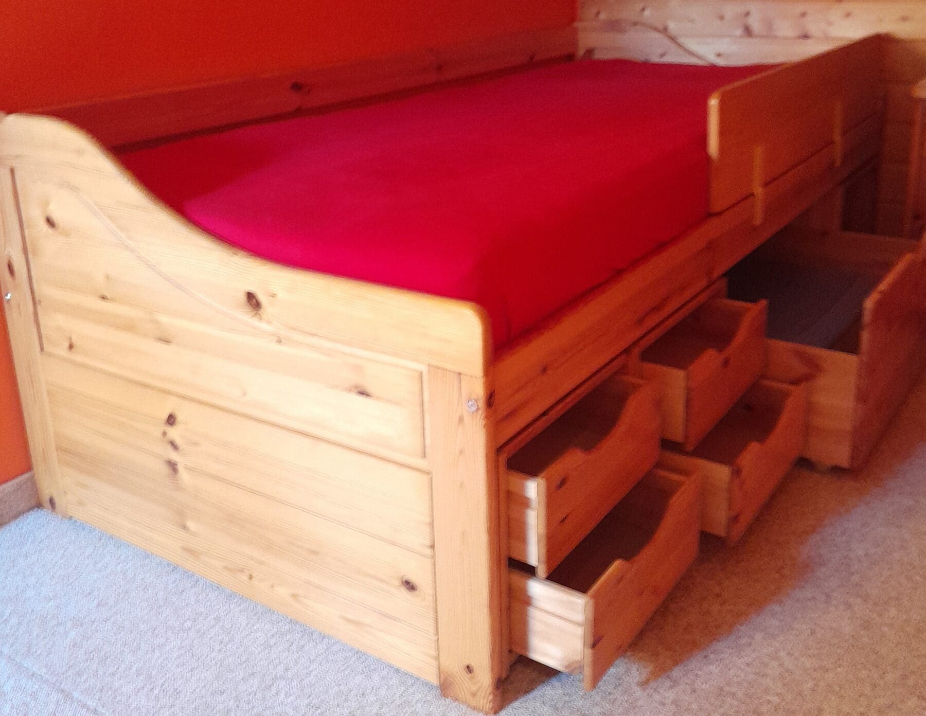 Zusätzlich ist das Schubladenbett mit einem passenden Massivholzrost ausgestattet. Dieser sorgt für eine optimale Unterstützung auf der eine neuwertige Matratze sich befindet.