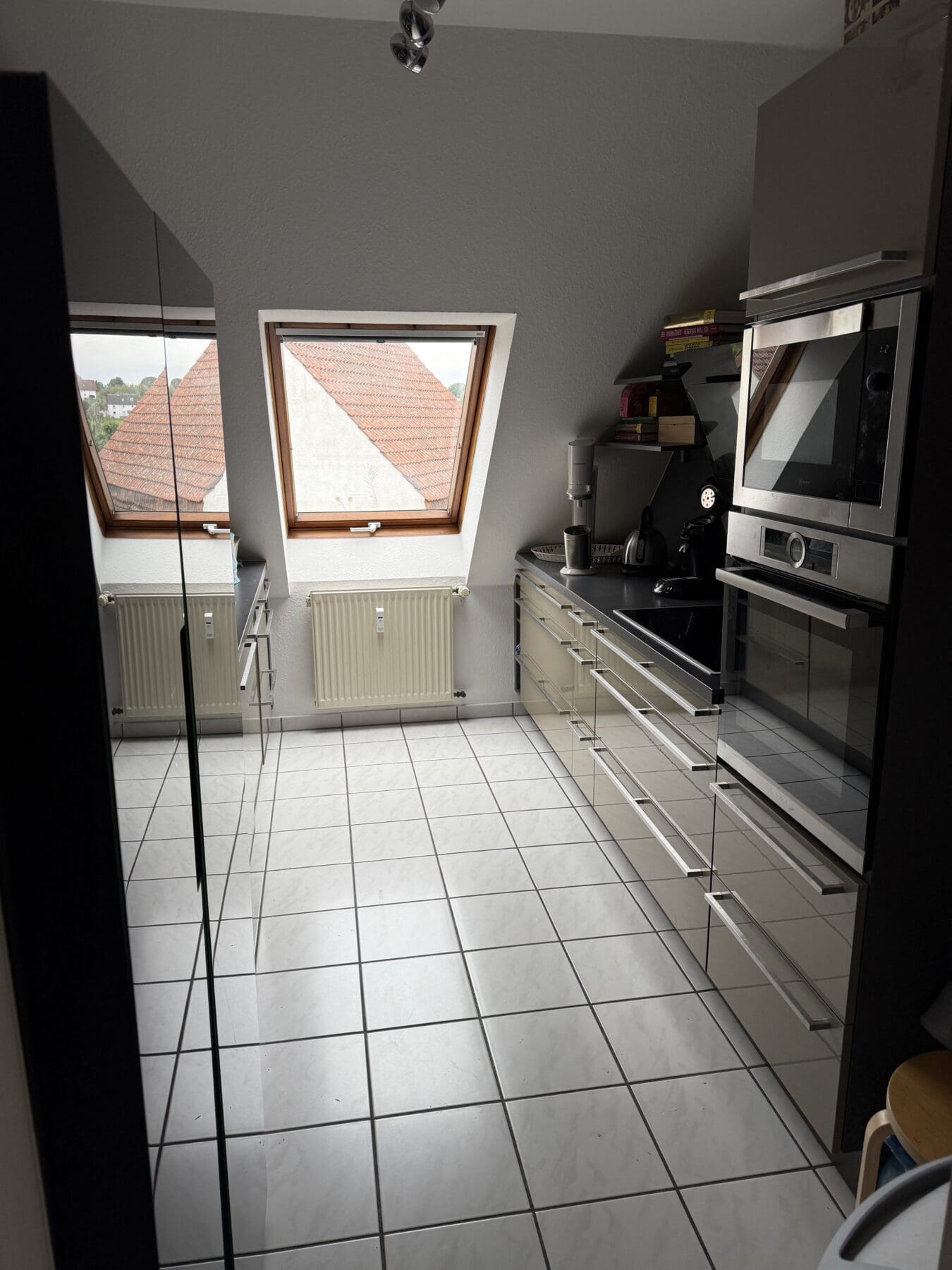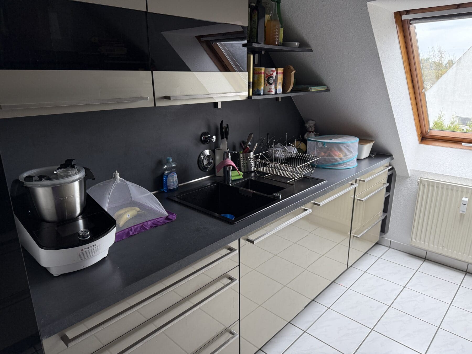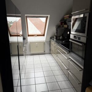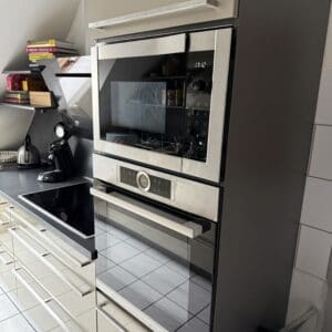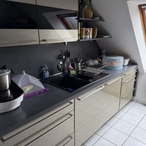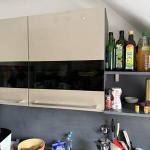 Verkaufe hier ab 15.12.25 eine gepflegte, moderne Einbauküche in Hochglanz-Optik (Beige / Grau) inklusive hochwertiger Elektrogeräte von Neff und Bosch.