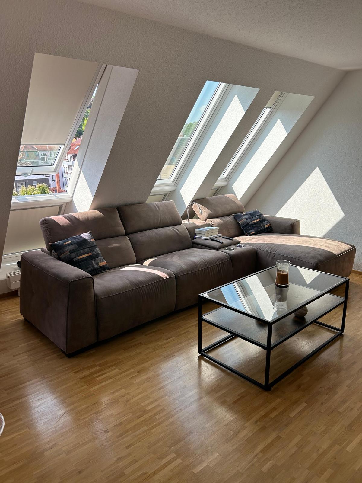 Wir verkaufen unser gemütliches 3-Sitzer-Sofa. Es war ursprünglich (beim Umzug) wie neu, wurde jedoch für eine Zeit gelagert und hat daher leichte Gebrauchsspuren wie kleine Flecken und Dellen (siehe Fotos). Der Zustand ist insgesamt noch gut.